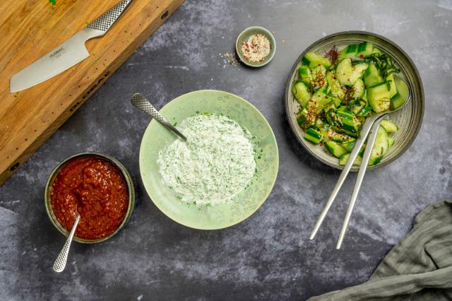 Når du skal skrive indkøbsliste til grillaftenen, går det normalt nemt i starten. Du finder ud af, hvad der skal lægges på kullene, men hvad så? Hvis du mangler inspiration, kan du se her, hvor vi viser dig tre forskellige slags tilbehør, der passer perfekt til grillmad. En green goddess-urtedressing, en pærelet hjemmelavet barbequesauce og en japansk knust agurkesalat.