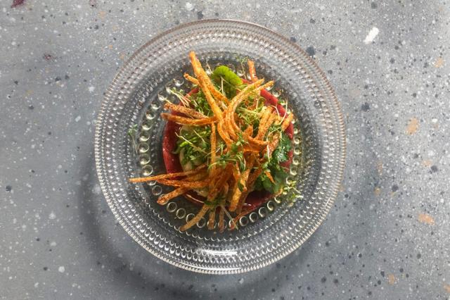 Form kødet til bøffer ved hjælp af en udstikkerring. Smør tatarsauce på. Kom kartofler og krydderurter på toppen. Slut af med olivenolie og lidt sort peber.