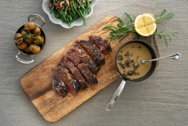 Når entrecôte tilberedes på den rette måde, bliver kødet utroligt mørt og rigt på smag. Her serverer vi entrecôte sammen med sauterede bønner og en fyldig morkel- og pebersauce, som giver retten både dybde og friskhed.