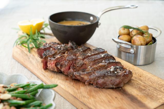 Tricket til at få succes med entrecôte er at stege den ved høj varme i kort tid. Brug gerne en carbonstålpande, da carbonstål giver en jævn varmefordeling til kødet og tåler høje temperaturer. Carbonstål fungerer på alle varmekilder – endda over åben ild.