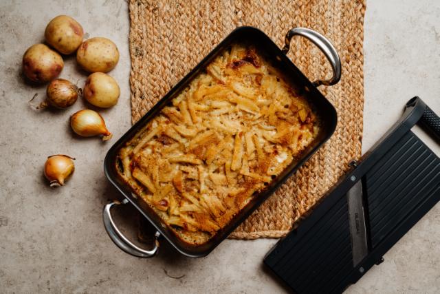 En perfekt tilberedt Jansson fristelse er svær at overgå. Hemmeligheden ligger i at bruge den rette flødeblanding, melede kartofler og en skarp mandolin, der hjælper dig med at skære fine skiver eller stave.