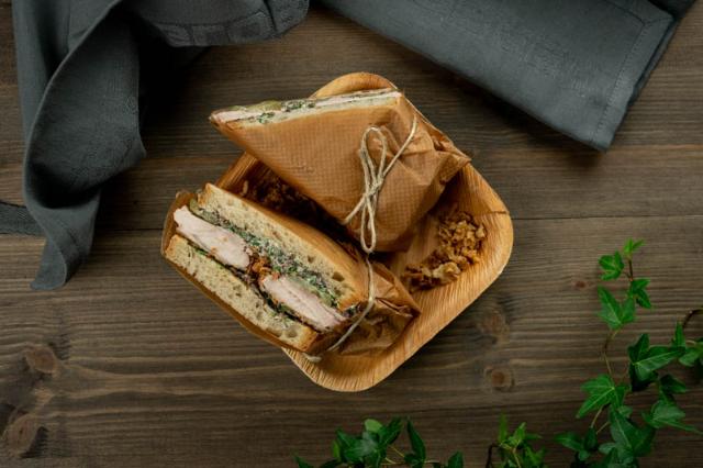 Læg brødskiverne klar. Smør rigeligt med svampecreme på. Læg kylling og saltagurk i skiver på. Kom ristede løg på toppen. Pak sandwichen ind i bagepapir, og bind snoren rundt om begge ender. Del den i to, og servér!