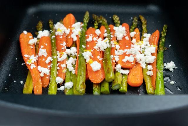 Gulerødder og asparges, der er blevet ristet i ovnen – og så lidt smuldret gedeost på toppen. Der skal ikke meget mere til for at skabe magi på tallerkenen!