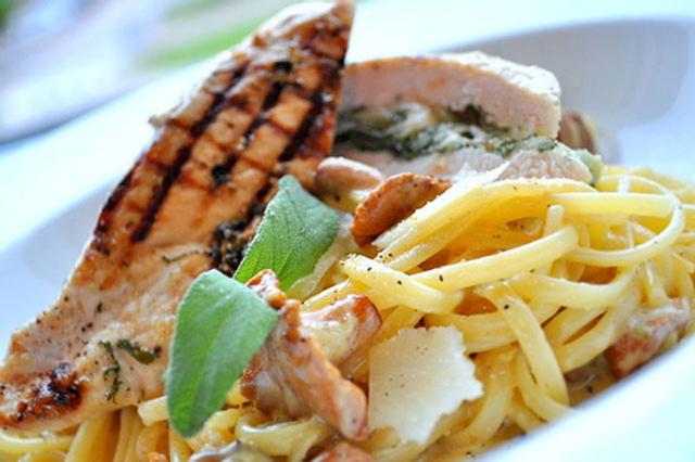 Kokken Louise Johansson serverer en lækker pastaret med fyldt kyllingebryst og kantareller. Et godt tip er at blande pastaen med saucen inden servering – det gør retten både mere cremet og endnu mere smagfuld!