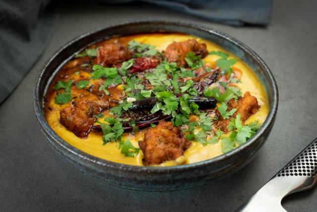 Lav ægte indisk mad derhjemme! Denne velsmagende opskrift kombinerer en varm yoghurtbaseret curry med sprøde kikærtefritters og chiliolie.