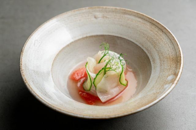 ”En hurtig og elegant smagsbombe til forret" - sådan beskriver kokken Louise Johansson sin rose af hiramasa, blodgrape, agurk og radise. Hiramasa er en fed fisk, der er nært beslægtet med makrel og passer perfekt til denne type sashimi-rette. Kan du ikke finde den i fiskeafdelingen? Ja, så kan du fint bruge kammuslinger i stedet.