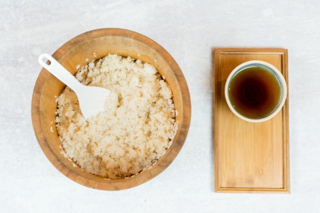 Sushi-su: Læg alle ingredienser i en kasserolle og varm det langsomt op indtil sukkeret er opløst. Lad det derefter køle af.