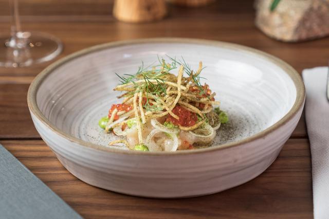 Den professionelle svenske kok Stefan Karlssons tartar på kuller og rå rejer. Serveret med ørredrogn, sukkertangskrydret kartoffelchips og dressing med smag af dild og brunet smør.