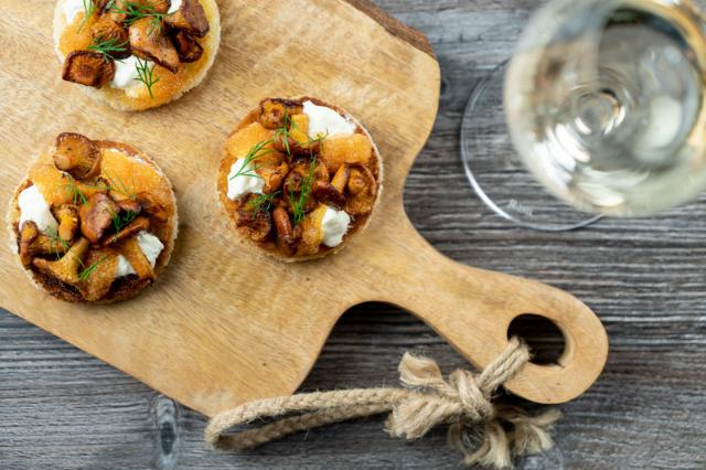 Lad kantarellerne leve op til deres status som skovens guld. På denne toast får svampen selskab af lækker stenbiderrogn, cremefraiche og dild. Hvis du vil gøre det endnu mere luksuriøst, så pop champagnen og tag bobleglassene frem! Her har vi en forret, der passer perfekt sammen med kold champagne.
