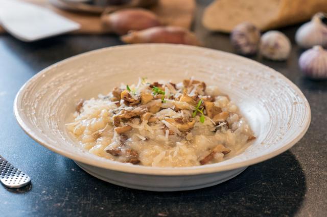 Når risottoen har en cremet konsistens, og al bouillon er absorberet, tilsættes smør og revet parmesan.