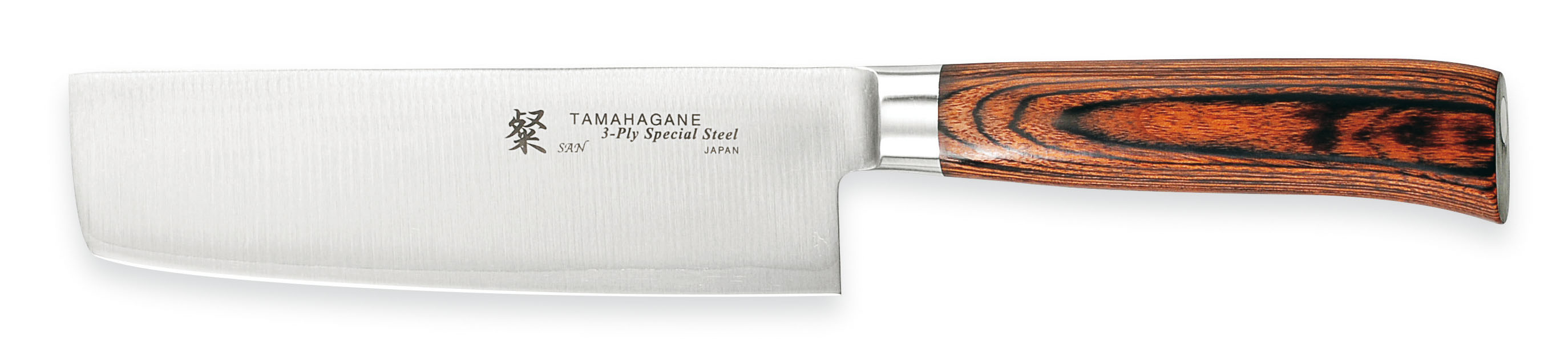Tamahagane San er en knivserie med blad i tre lags stål. Knivbladet er opbygget af en kombination af hårdt og blødt stål, præcis som et traditionelt samuraisværd. Kernen består af VG5-stål. Stålsorten indeholder en høj andel kulstof og er meget hård, hvilket gør, at æggen kan slibes sylespids. De to yderste lag består af et blødere, mere rustbestandigt stål. Denne opbygning giver knivene en fantastisk æg i kombination med en ekstrem styrke og rustbestandighed. Hårdhedsgraden er 58-59 HRC.