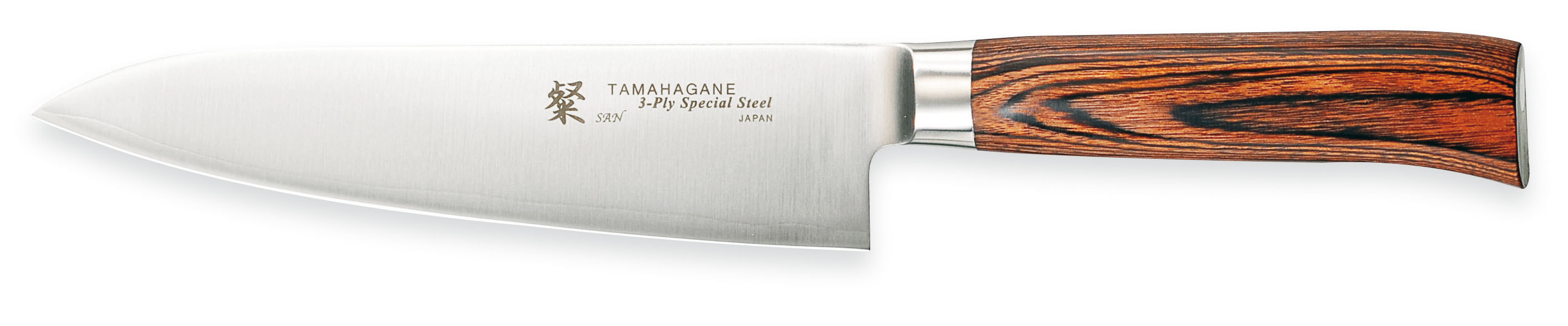 Tamahagane San er en knivserie med blad i tre lags stål. Knivbladet er opbygget af en kombination af hårdt og blødt stål, præcis som et traditionelt samuraisværd. Kernen består af VG5-stål. Stålsorten indeholder en høj andel kulstof og er meget hård, hvilket gør, at æggen kan slibes sylespids. De to yderste lag består af et blødere, mere rustbestandigt stål. Denne opbygning giver knivene en fantastisk æg i kombination med en ekstrem styrke og rustbestandighed. Hårdhedsgraden er 58-59 HRC.
