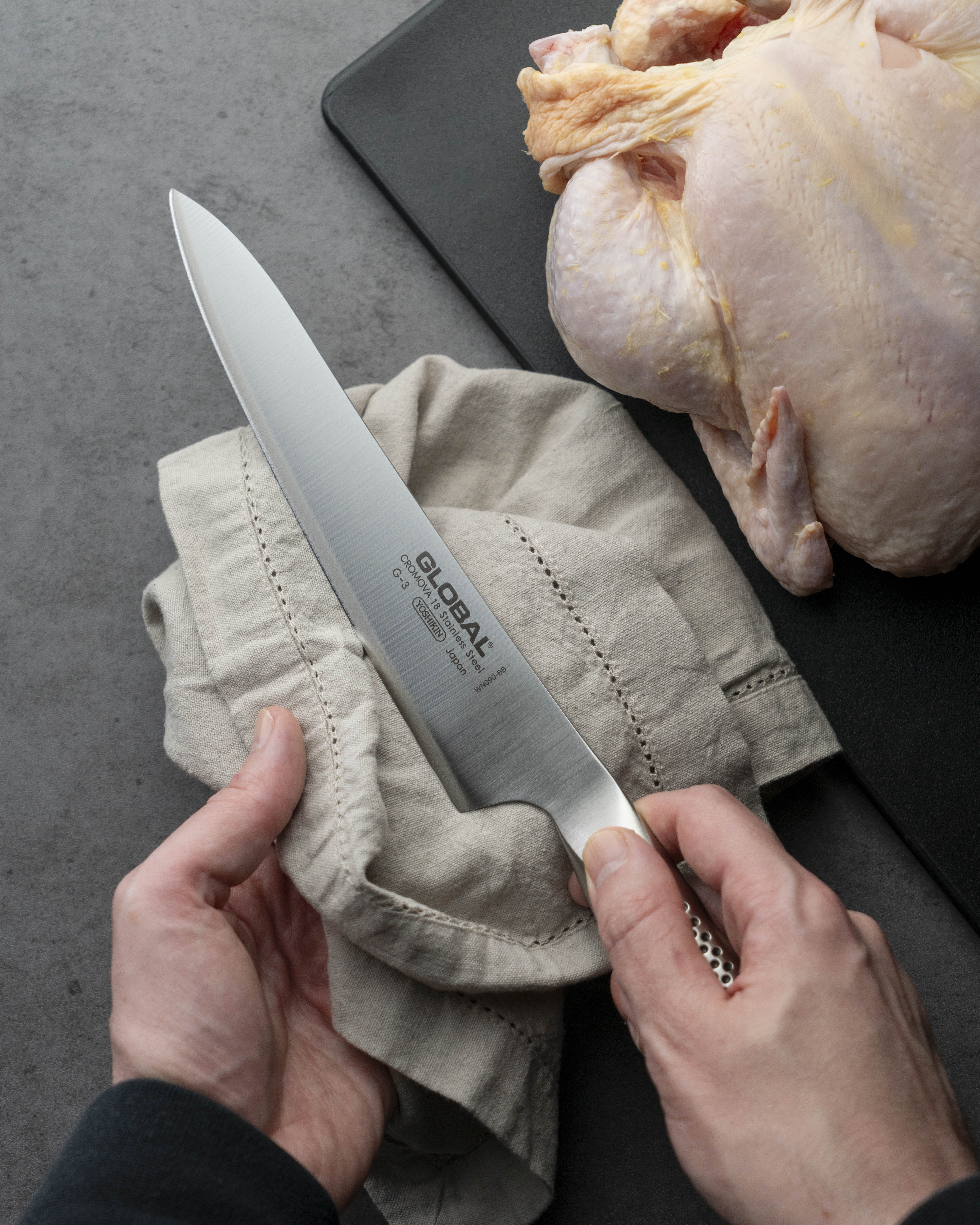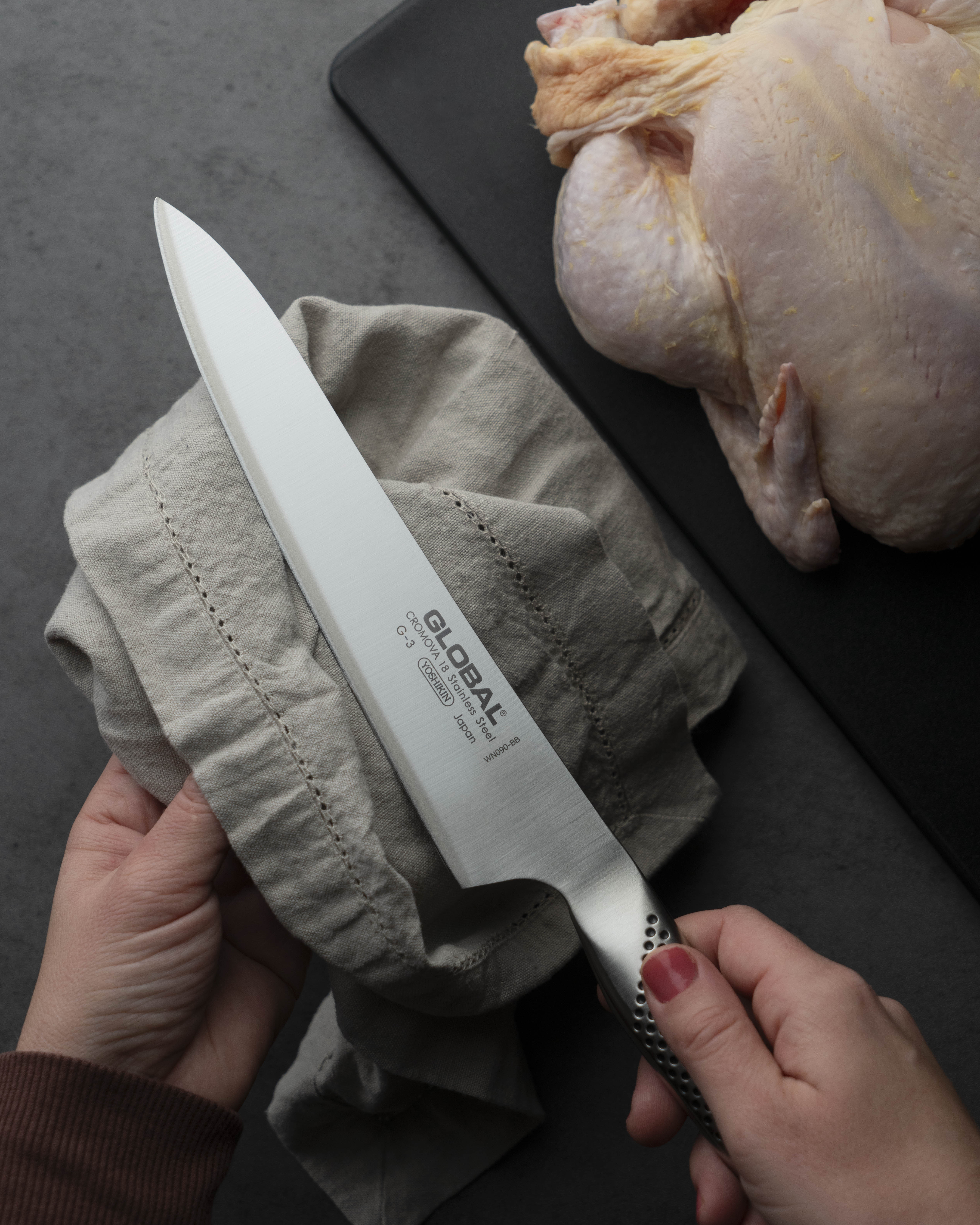 En fabriksny Globalkniv er ekstremt skarp. Præcis så skarp, som du ønsker, at en køkkenkniv skal være. Men for at din kniv kan fortsætte med at præstere på samme niveau, er der nogle ting, du skal være opmærksom på.