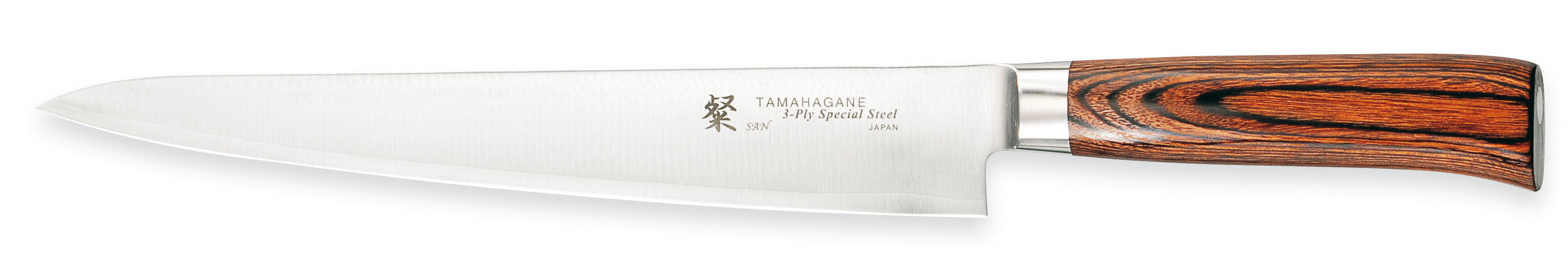 Tamahagane San er en knivserie med blad i tre lags stål. Knivbladet er opbygget af en kombination af hårdt og blødt stål, præcis som et traditionelt samuraisværd. Kernen består af VG5-stål. Stålsorten indeholder en høj andel kulstof og er meget hård, hvilket gør, at æggen kan slibes sylespids. De to yderste lag består af et blødere, mere rustbestandigt stål. Denne opbygning giver knivene en fantastisk æg i kombination med en ekstrem styrke og rustbestandighed. Hårdhedsgraden er 58-59 HRC.