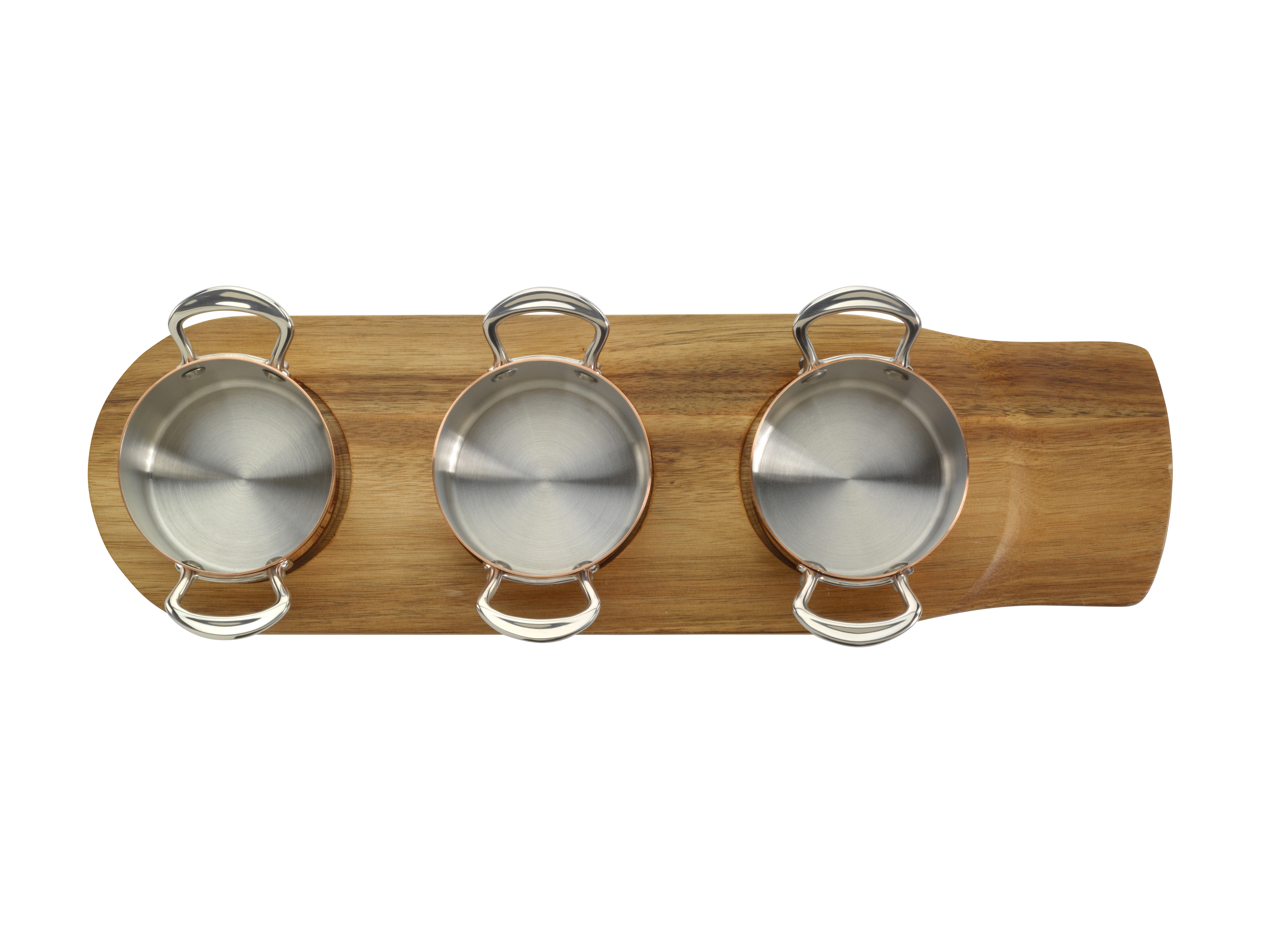- Tre minigryder i rustfrit stål med en elegant, kobberbelagt yderside. De kan med fordel anvendes sammen med stege- og kogegrejet fra serien Copper Induction. Den kompakte størrelse gør gryderne perfekte til servering – ideelle, når du skal dække et tapasbord. Serveringsbræt i træ medfølger. Gryderne fungerer ikke på induktion. Håndopvask anbefales.