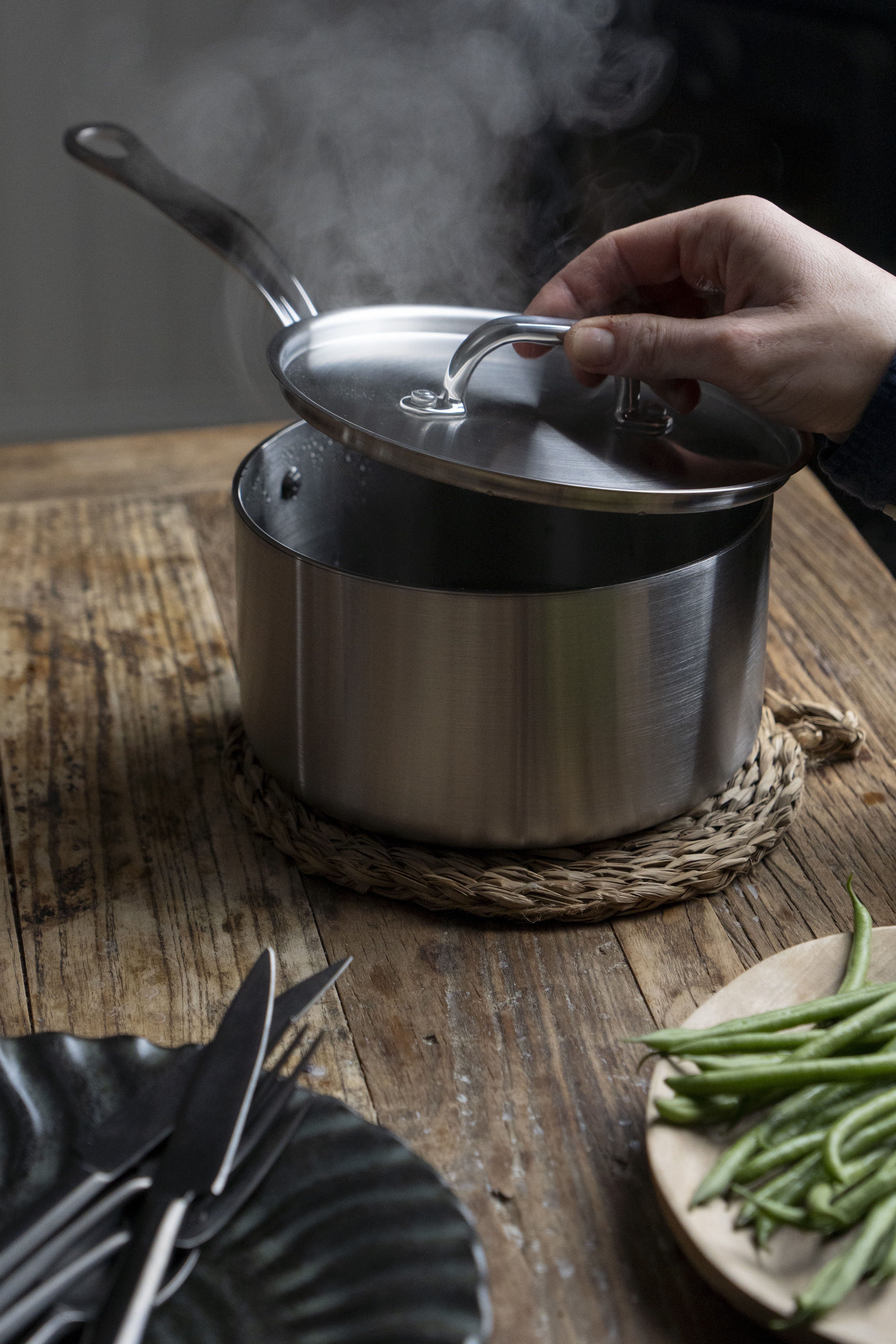 - En kasserolle i rustfrit stål med en elegant, børstet finish. Modellen er velegnet til saucer og mindre gryderetter. Låg i rustfrit stål medfølger.