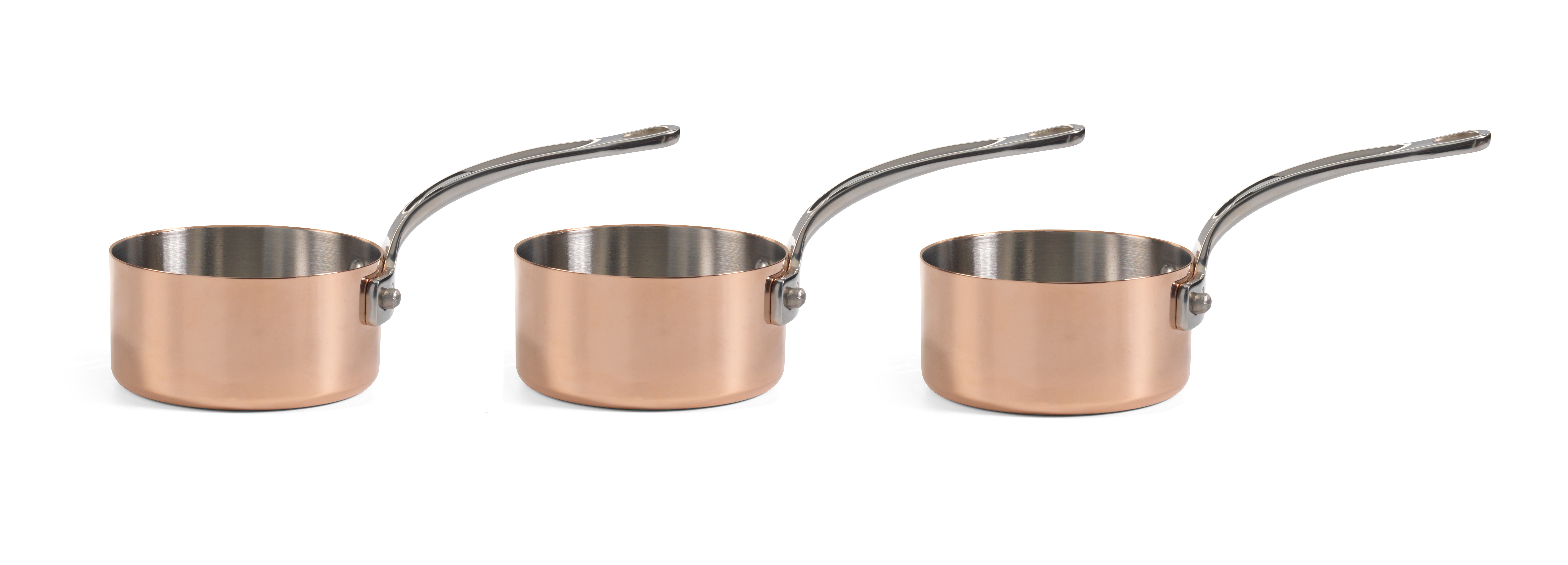 Tre minikasseroller i rustfrit stål med en elegant, kobberbelagt yderside. De kan med fordel anvendes sammen med stege- og kogegrejet fra serien Copper Induction. Den kompakte størrelse gør kasserollerne perfekte til servering – ideelle, når du skal dække op til et tapasbord. Kasserollerne fungerer ikke på induktion. Håndopvask anbefales.