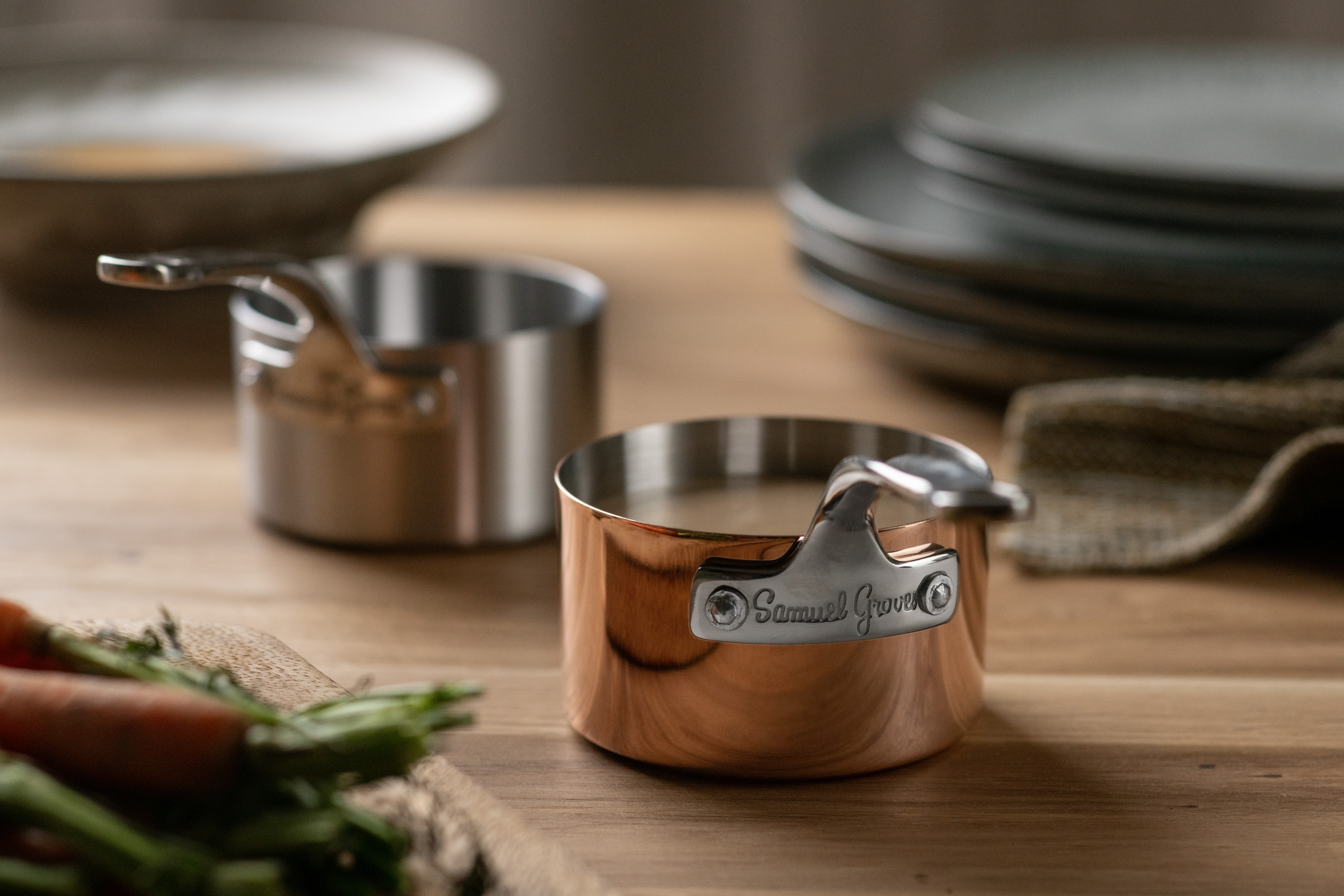 Serveware er en lille, elegant serie, der fungerer som et supplement til Samuel Groves hovedsortiment. Den består af en samling små, dekorative kasseroller og gryder, der hjælper dig med at præsentere maden med stil. Produkterne fås i både rustfrit stål og kobber og har et design, der passer smukt sammen med de øvrige serier.
