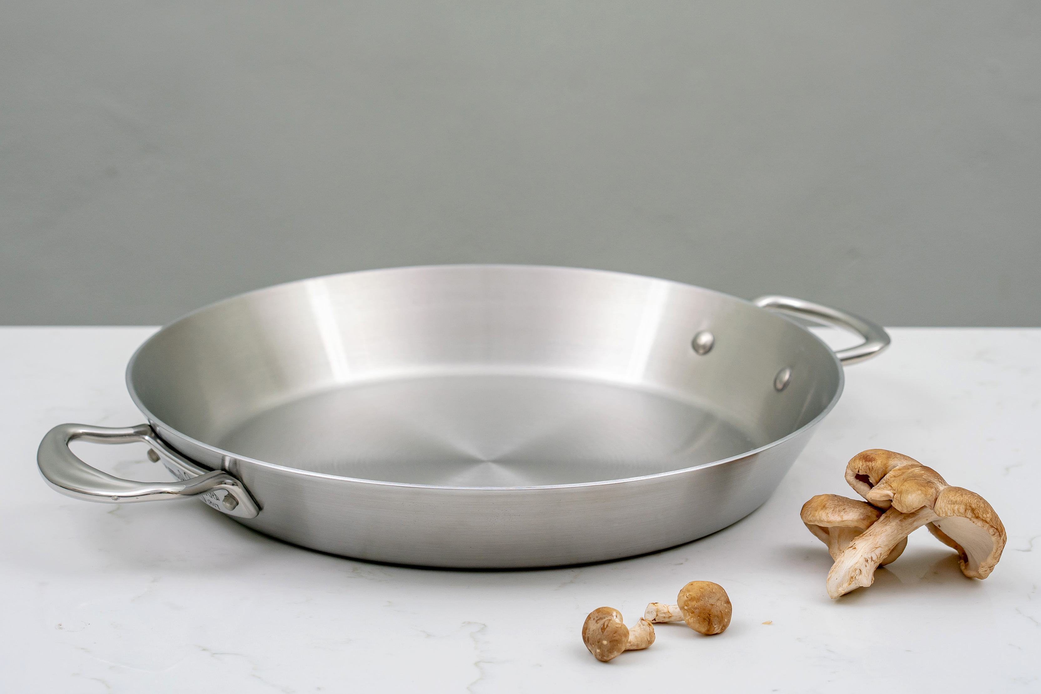 En serveringspande i rustfrit stål med en elegant, børstet finish. Panden er et must, når du skal tilberede paella eller andre retter, der kræver plads og en stor stegeskorpe. Den fungerer også fantastisk til servering.