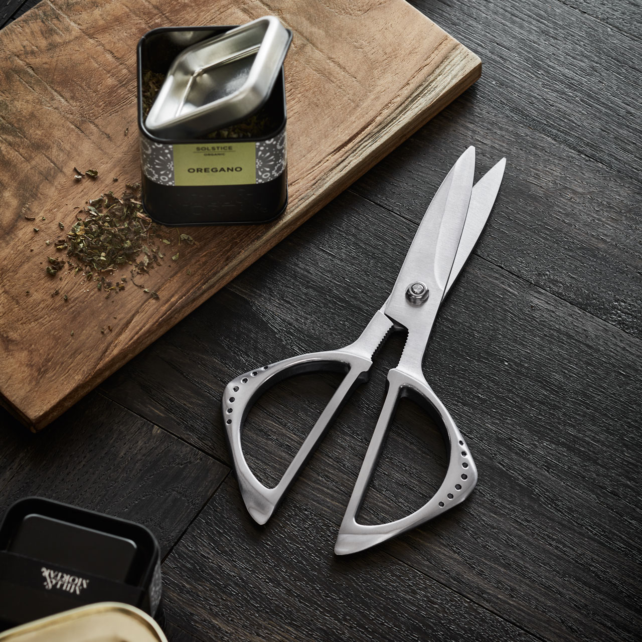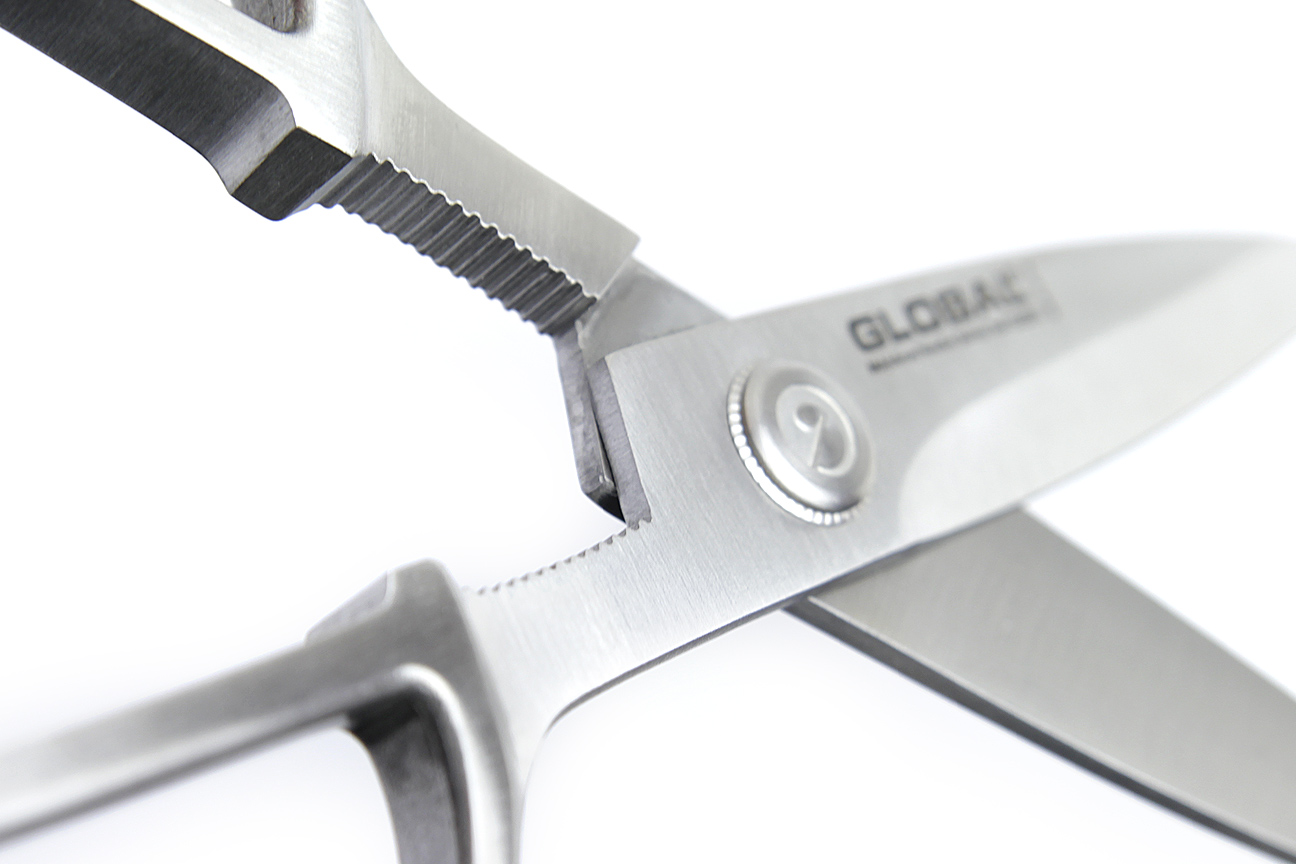 Globals køkkensakse er udstyret med en række smarte funktioner. Den har for eksempel en klo, som du kan bruge til at knække nødder eller krebs. Skaftet spidser ud i en kile, der hjælper dig med at lirke dåser op, der er svære at åbne. Saksens klinge har en mikrotandet kant, der giver et perfekt snit, når du klipper. Du kan nemt justere bladet med en skrue.