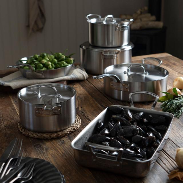 Classic Stainless Steel er en rustfri serie med en flot, børstet finish. Stege- og kogegrejet er fremstillet af tre lag metal, hvor det midterste lag består af aluminium, mens de øvrige to lag er af rustfrit stål. Denne kombination giver produkterne optimal varmefordeling og holdbarhed. Aluminium har nemlig en god varmeledningsevne, mens rustfrit stål er ekstremt holdbart og modstandsdygtigt overfor syre og fugt. Gryderne og panderne holder til mange års brug.